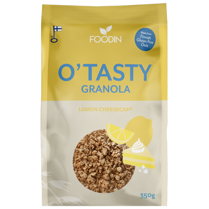 Upplev bättre frukost- och mellanmålsstunder med Foodins unika O’tasty Lemon Cheesecake-granola! Granolan är tillverkad och baserad på ren finsk havre, naturligt rik på fullkorn och fibrer.