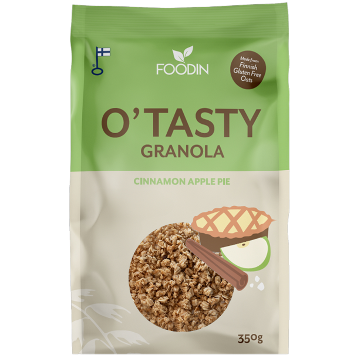 Upplev bättre frukost- och mellanmålsstunder med Foodins unika O’Tasty Cinnamon Apple Pie-granola! Denna granola är baserad på finsk ren havre, naturligt rik på fullkorn och fibrer.