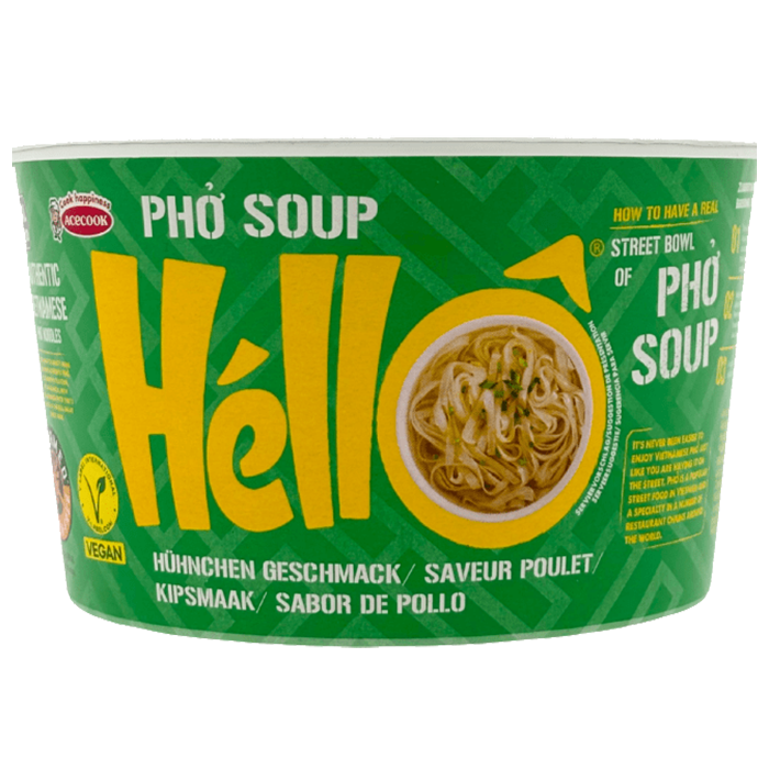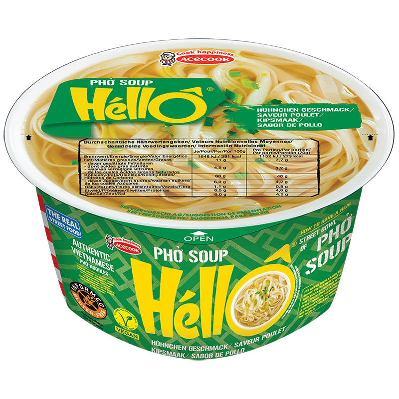 Risnudlar (72,9%): ris 60,6%, förtjockningsmedel (E1404), stärkelse, salt, emulgeringsmedel (E322 (innehåller SOJA), E466)
