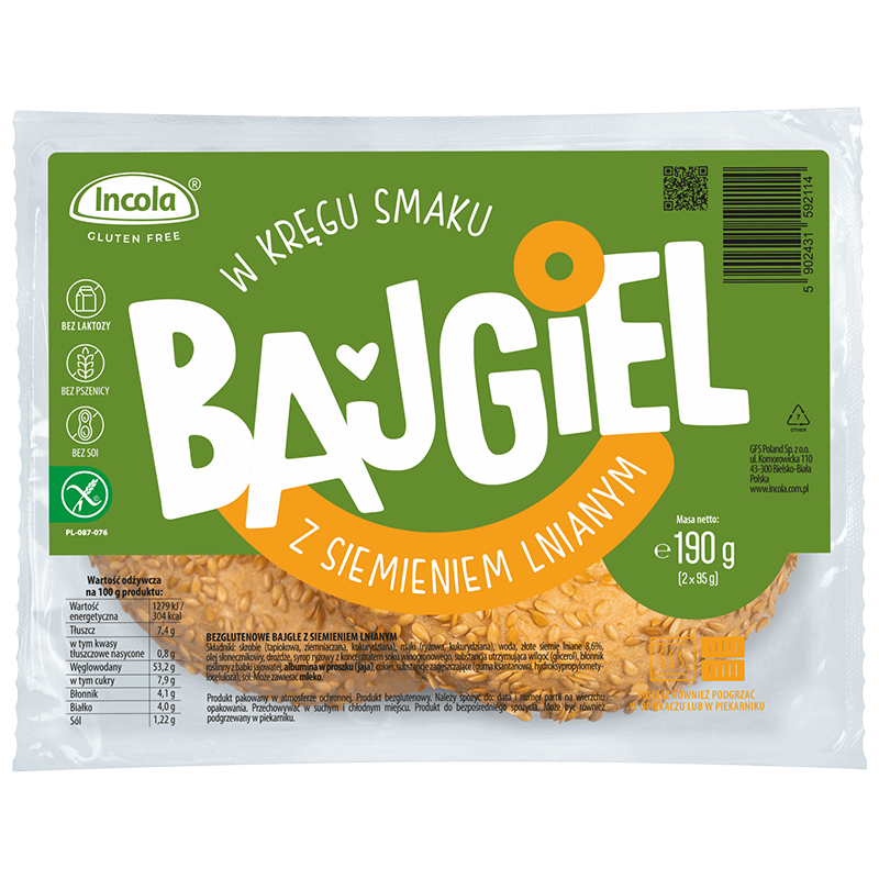 Stärkelse (tapioka, potatis, majs), mjöl (ris, majs), vatten, gyllene linfrö 8,6 %, solrosolja, jäst, rissirap med druvjuicekoncentrat, fuktighetsbevarande medel (glycerol), vegetabilisk fiber (psyllium), pulver av albumin (ägg), socker, förtjockningsmedel (xantangummi, hydroksypropyletylcelluos), salt