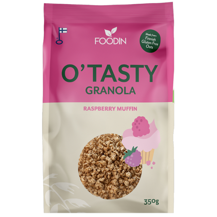 O’Tasty Hallonmuffinsgranola! Granolan är baserad på finsk ren havre, naturligt rik på fullkorn och fibrer. Denna läckra granola är gjord med ett ”free-from”-recept och innehåller inget tillsatt vitt socker, nötter, mjölk, vete, palmolja eller fröoljor, vilket gör den lämplig för en mängd olika dieter. OBS: Tillverkad i en anläggning som bearbetar nötter och mjölkprotein.