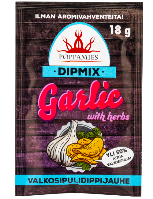 Det fantastiska vitlöksdipppulvret kommer att ta vitlöksälskare till dippparadiset. Poppamies vitlöksdipppulver innehåller en vansinnig mängd riktig vitlök, samt ett stort urval av olika örter, vilket gör detta till den bästa vitlöksdippen. Blanda en påse dipppulver med gräddfil och låt det stå i kylen i minst en halvtimme. Dippa med en mängd olika plockmat som kycklingvingar, pommes frites, lökringar, chips och mer. Om du vill ha en vegansk dipp, blanda dipppulvret med till exempel havrefraîche.