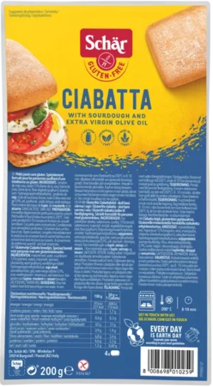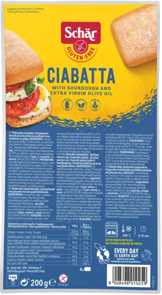 majsstärkelse, vatten, surdeg (rismjöl, vatten) 12%, majsmjöl, rismjöl, vegetabilisk fiber (psyllium), förtjockningsmedel: hydroxypropylmetylcellulosa; sojaprotein, solrosolja, jäst, extra jungfruolivolja 0.9%, salt, syror: citronsyra, vinsyra.