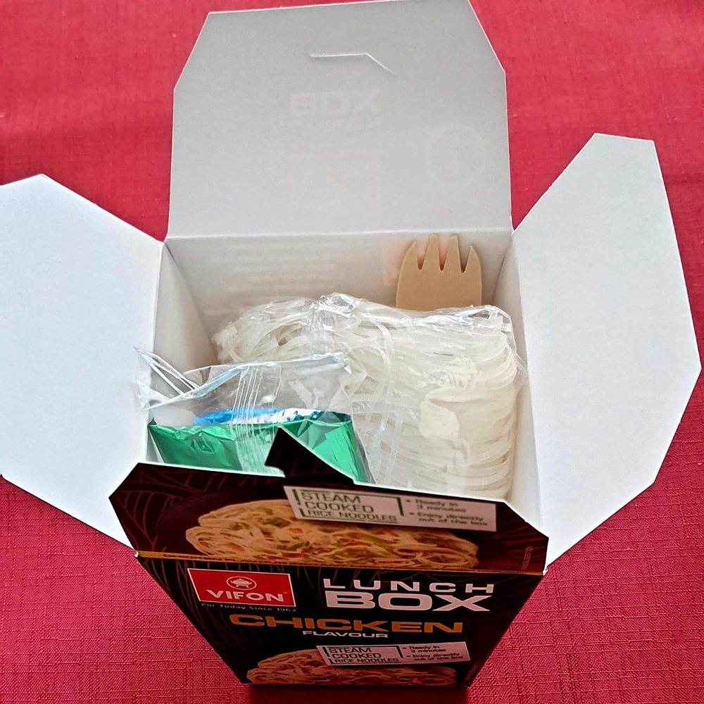 VIFON snabbrätt med risnudlar med klassisk kycklingsmak. En produkt vars innehåll kan konsumeras direkt från den praktiska kartongen.